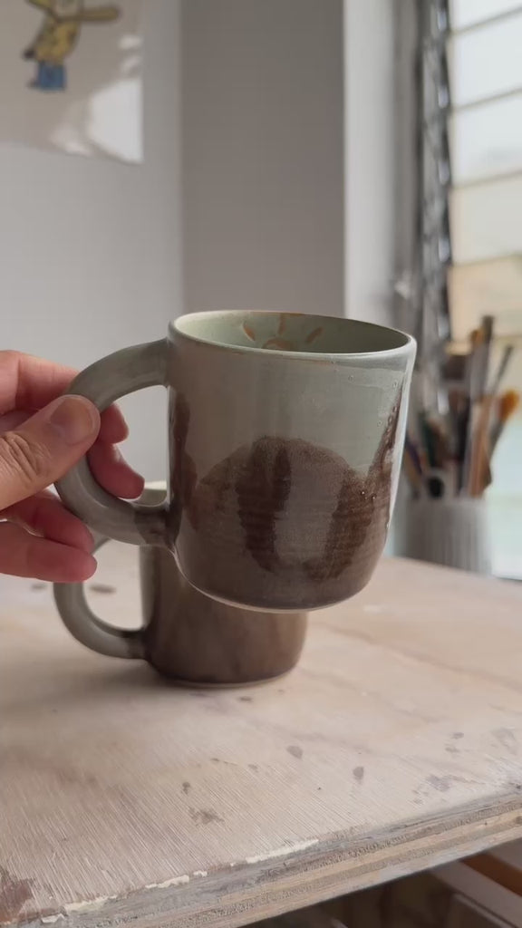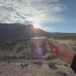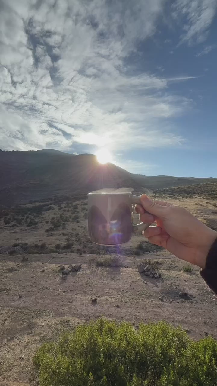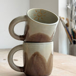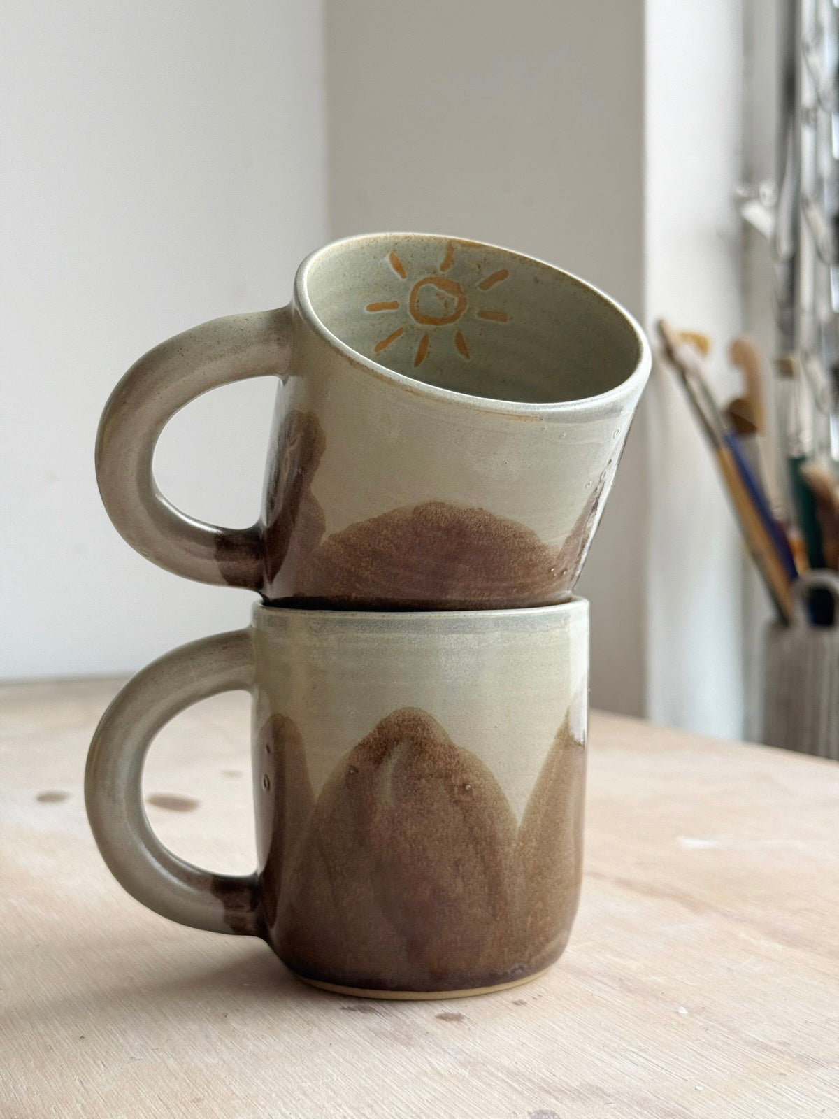 Hechas a mano en torno, dibujo del sol hecho en técnica de reserva usando cera y superposición de esmaltes para crear las montañas. Cada montaña es pintada una por una de manera suelta, haciendo de cada taza, una pieza única e irrepetible. Ninguna montaña se repite a la otra.