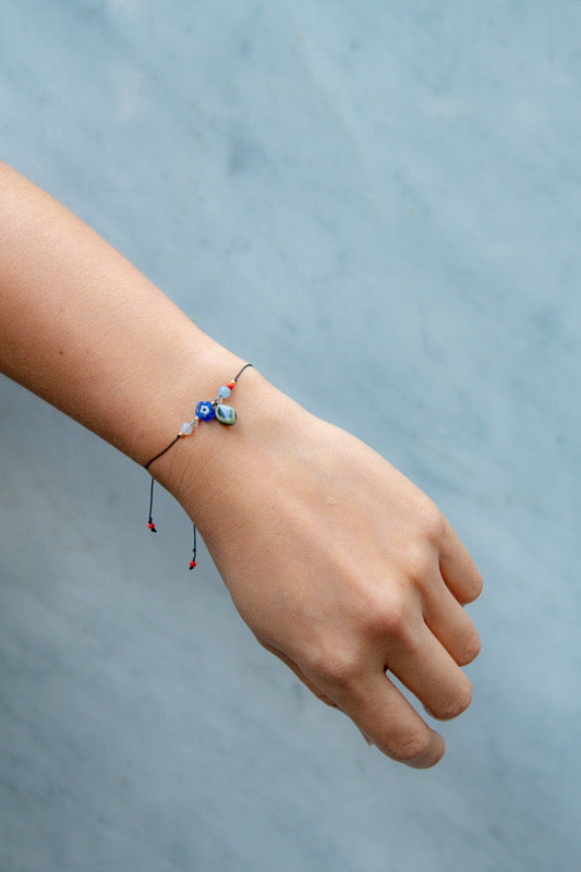 Pulsera autorregulable con nudo corredizo. Flor en vidrio Lampwork, hojita modelada a mano en cerámica gres y esmaltes de alta temperatura. Mostacillas doradas galvanizadas Miyuki, muranos y cuentas de piedra Ágata.