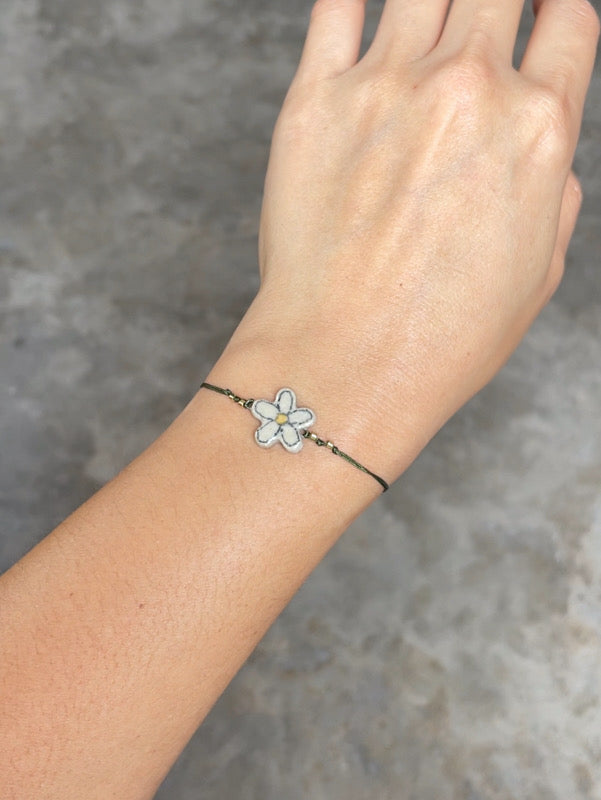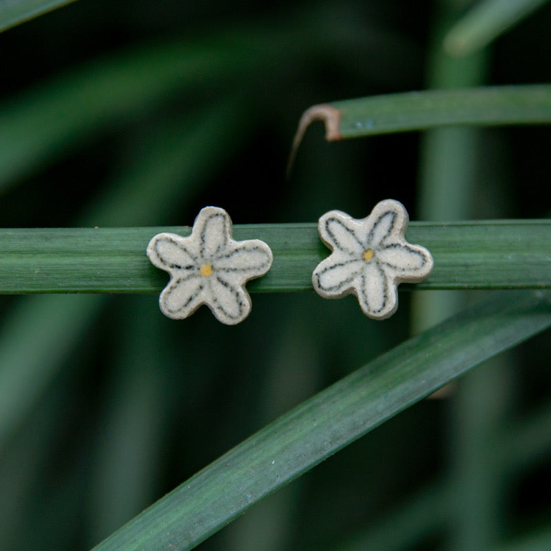 Divertidos y sutiles aretes pegados hechos a mano en cerámica gres y esmaltes de alta temperatura. Flor dibujada con lápiz cerámico.